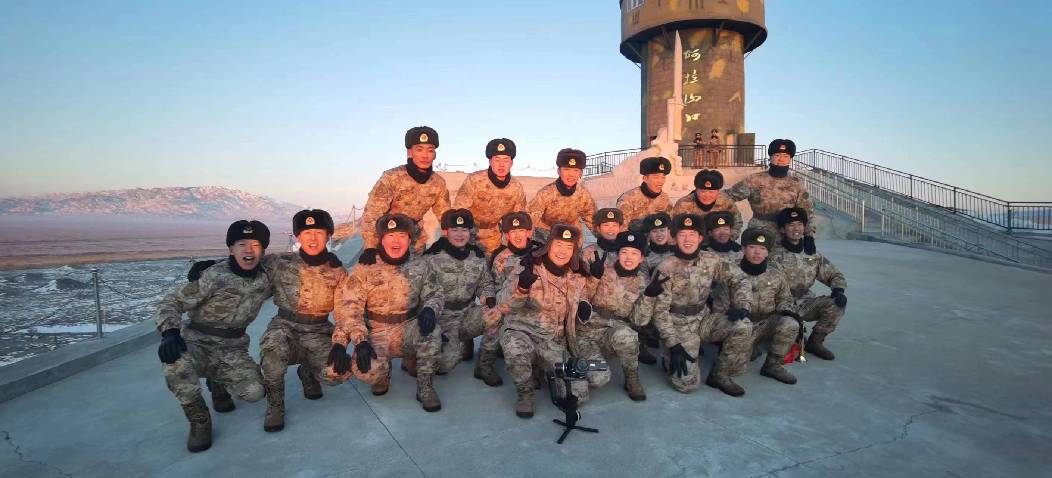 新闻传播中心-刘艺-2023年大年初一,在新疆军区某边防团阿拉山口边防连直播升旗仪式后与官兵合影